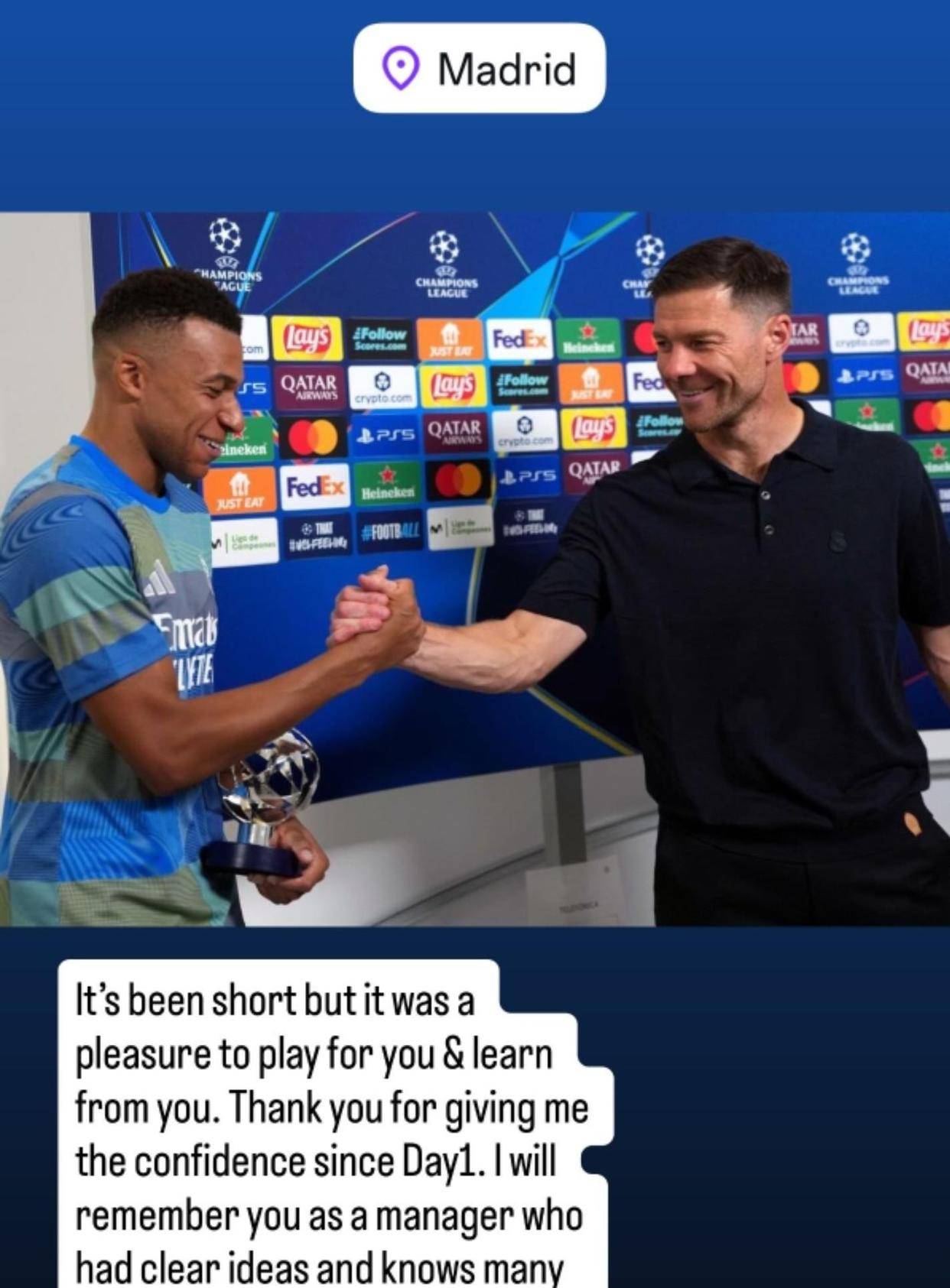皇马又换主教练了!姆巴佩祝福阿隆索:为您效力很荣幸